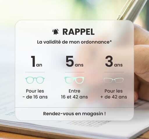 Il est peut-être temps de renouveler vos verres ? Bonne nouvelle : vous pouvez le faire directement chez votre opticien ! 👁️ La durée de validité de votre ordonnance dépend de votre âge : – Moins de 16 ans : 1 an – De 16 à 42 ans : 5 ans – Plus de 42 ans : 3 ans Pensez aussi à consulter régulièrement votre ophtalmologiste pour un suivi complet de votre vue. Nous sommes là pour vous accompagner avec expertise et bienveillance. Prenez rendez-vous sans attendre pour retrouver une vision confortable ! 😊